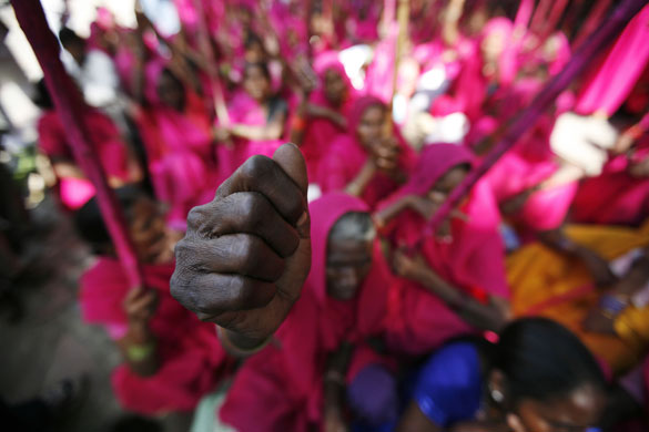 Nueva Delhi, India: Los miembros de la pandilla "Gulabi" (banda de color rosa), grupo de vigilantes de la mujer, gritan consignas durante una protesta, en demanda de un estado independiente de Bundelkhand.