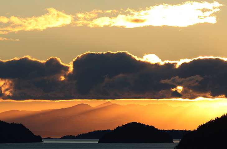 Columbia Británica, Canadá: El sol se pone sobre las montañas y las aguas circundantes a la bahía de Horseshoe.
