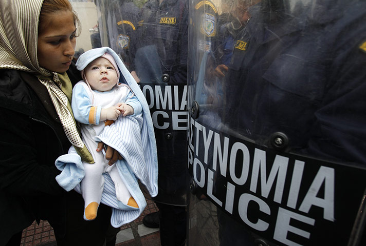 Atenas, Grecia: Una mujer afgana con un niño se pone delante de la policía antidisturbios durante una manifestación frente al Parlamento griego. Se estima que medio millón de inmigrantes ilegales y solicitantes de asilo viven en Grecia, muchos de ellos en Atenas, y cada vez son más los que tratan de entrar en la UE a través del país.