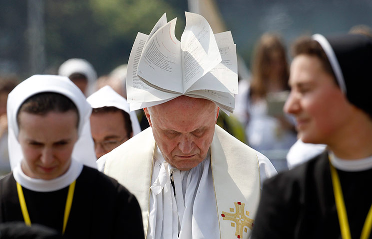 Zagreb, Croacia: Un sacerdote utiliza un libro para protegerse del sol durante la visita de 2 días del Papa Benedicto XVI a Croacia.