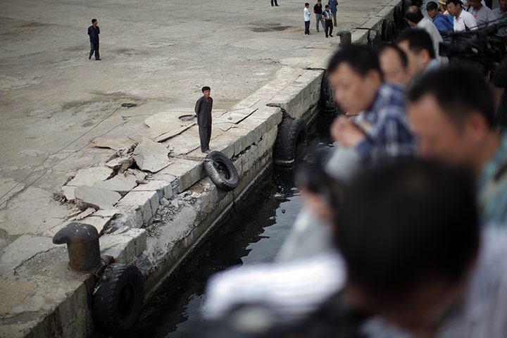 Rason City, Corea del Norte: Un hombre mira hacia arriba desde el muelle dañado por el crucero Mangyongbyong durante su viaje inaugural.